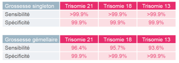 Ce test permet un dépistage non invasif (prélèvement sanguin maternel sans risque pour le fœtus) dont les performances en termes de sensibilité et spécificité sont bien supérieures à celles du dépistage par les marqueurs sériques (taux de détection de 99 % pour le DPNI et de 84,7 % pour le dépistage par les marqueurs sériques*).